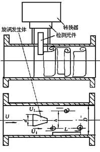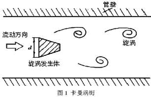 在流體中設置旋渦發生體(阻流體),從旋渦發生體兩側交替地產生有規則的旋渦,這種旋渦稱為卡曼渦街(見圖1),旋渦列在旋渦發生體下游非對稱地排列。根據卡曼渦街原理,有如下關系式: