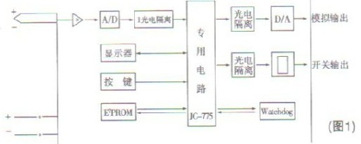 智能流量積算儀是由測量回路、數字面板表、調節器和電源四個部分組成。穩壓電源將220V供電轉換成穩定的直流電壓作為其它部分電源。測量回路將流量變送器送來的信號(電壓、電流等)經過處理后,變為電壓信號。該信號經過A/D轉換后輸送到JC-775專用中央處理器進行處理后,不僅要送到數字面板表,而且也要送到調節器,與設定值比較后按調節規律輸出控制或報警信號。工作原理框(圖1)