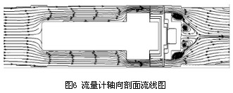 以流量Q=250m3/h的數值模擬計算結果為例進行渦輪流量計內部流場及壓力場的分析.圖5為渦輪流量計軸向剖面靜壓分布圖.前導流器前后的壓力場分布較均勻且壓力梯度較小,在機芯殼體與葉輪支座連接凸臺處壓力有所增加,連接面后壓力又逐漸減小.故認為流體流經葉輪支座產生壓力損失的主要原因是連接處存在凸臺,導致流場出現較大變化,不能平滑過渡,建議將葉輪支座與機芯殼體的連接改為圓弧線型或流線型。