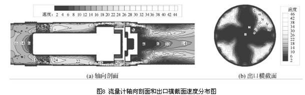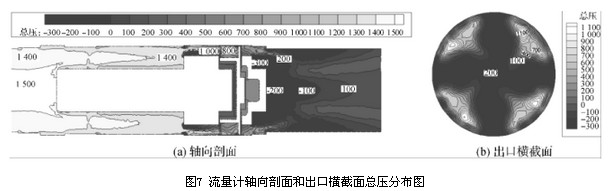 結合圖7、圖8流量計軸向剖面和出口橫截面的總壓及速度分布圖,其速度分布與壓力分布相似,流量計流道內速度分布較均勻的區域其壓力梯度變化也較小,即流道內速度的分布和變化與壓力損失大小相關。由流量計軸向剖面和出口橫截面的速度及壓力分布圖可以看出,流量計后導流器處產生的漩渦二次流影響了出口橫截面處的速度及壓力分布