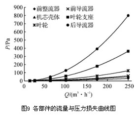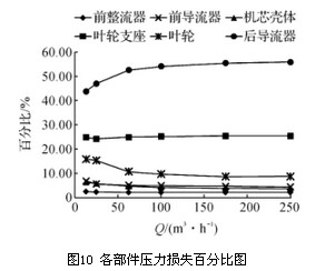2)分析各部件對壓力損失的影響,其壓力損失與流量成二次函數關系。后導流器相對于其他部件是壓力損失的主要因素,約占總壓力損失的一半,隨著流量的增加其壓力損失占總壓力損失的比例上升了12.06%。葉輪支座的壓力損失約占總壓力損失的1/4,其壓力損失比例隨流量的增加基本不變。隨著流量的增加葉輪產生的壓力損失比例降幅明顯。