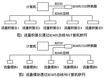 進入計算機,由計算機監視和管理,這是流量計量的一個新的里程碑,它將大大提高流量計量的可靠性和計量精度。流量儀表網絡通訊有兩大發展趨勢,一種發展趨勢是近距離的網絡通訊,如一個大企業內部流量儀表,可以通過 RS485 總線與計算機構成網絡,由計算機集中監測和管理。如圖1、圖2。