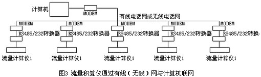 另一種是遠距離的網絡通訊,如熱力公司向市內的多個用熱企業供熱,可以通過有線電話或無線電話,將流量儀表與計算機構成網絡。如圖3所示。