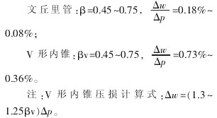 它是某一結構形式產品的壓損。 比較上述節流裝置的壓損, 可見孔板、V 形內錐、噴嘴屬于高壓損節流件,V 形內錐處于孔板與噴嘴之間。 文丘里管為低壓損節流件。