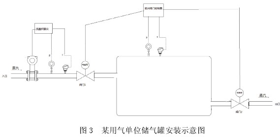 上圖這個系統中,閥門控制器根據罐內壓力來自動控制閥門一,閥門二的開閉。這兩個閥門為電磁閥,開閉的執行時間非常短暫。當儲氣罐為空,即壓力接近常壓時,閥門一打開,蒸汽由入口放入進入充氣階段,流量計開始計量,儲氣罐內壓力上升到某點后,儲氣罐充滿,閥門一關閉,蒸汽流量計停止計量,閥門二打開,蒸汽由閥門二出口處排出到生產部門,儲氣罐排空后作如上循環工作。