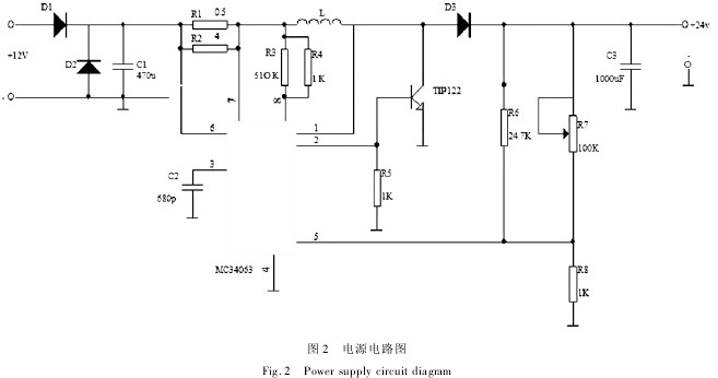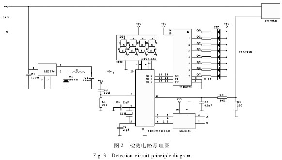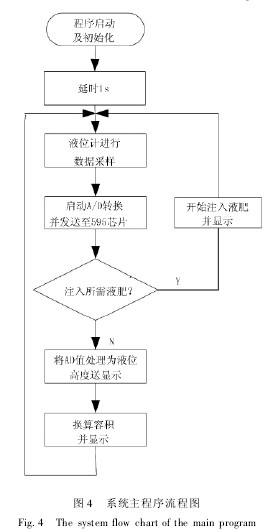 0引言 液位包括液位信號(hào)器和連續(xù)液位測(cè)量兩種。液位信號(hào)器是對(duì)幾個(gè)固定位置的液位進(jìn)行測(cè)量,用于液位的上、下限報(bào)警等;連續(xù)液位測(cè)量是對(duì)液位連續(xù)地進(jìn)行測(cè)量,廣泛應(yīng)用于農(nóng)田灌溉、定量施量、高爐沖渣水位測(cè)量、環(huán)境監(jiān)測(cè)等農(nóng)業(yè)生產(chǎn)領(lǐng)域,具有非常重要的意義。目前,對(duì)液位測(cè)量的精度要求不僅愈來愈高,且需要測(cè)量儀能夠適應(yīng)一些特殊環(huán)境,如高溫、高壓、強(qiáng)放射性及強(qiáng)腐蝕性等條件。液態(tài)肥因其生產(chǎn)費(fèi)用低、肥效高、易吸收、節(jié)支增產(chǎn)效果顯著及施用過程中可以根據(jù)需要加入土壤所缺少的植物營養(yǎng)元素等優(yōu)勢(shì)迅速得到了廣泛應(yīng)用。而變量施肥作為農(nóng)業(yè)的重要部分,其技術(shù)基礎(chǔ)就是對(duì)液肥液位的準(zhǔn)確控制。目前市場(chǎng)上,液位控制系統(tǒng)大致可分為以下兩種: 1)機(jī)械式控制系統(tǒng)。機(jī)械式控制系統(tǒng)結(jié)構(gòu)簡(jiǎn)單、成本低廉;但這種控制裝置故障多、誤動(dòng)作多,且只能單獨(dú)控制,與計(jì)算機(jī)進(jìn)行通信較難實(shí)現(xiàn)。 2)交流調(diào)壓/變頻調(diào)速控制系統(tǒng)。該系統(tǒng)是通過安裝在水泵出口管道上的壓力傳感器,把出口壓力變成標(biāo)準(zhǔn)工業(yè)電信號(hào)的模擬信號(hào),經(jīng)過前置放大、多路切換、A/D變換成數(shù)字信號(hào)傳送到單片機(jī),經(jīng)單片機(jī)運(yùn)算與給定量的比較,進(jìn)行PID運(yùn)算,得出調(diào)節(jié)參量;經(jīng)由D/A變換給調(diào)壓/變頻調(diào)速裝置輸入給定端,控制其輸出電壓變化,來調(diào)節(jié)電機(jī)的轉(zhuǎn)速,以達(dá)到控制水位的目的。 本文以液態(tài)施肥機(jī)為依托,針對(duì)一定體積的液肥進(jìn)行液位試驗(yàn),通過以單片機(jī)和投入式液位計(jì)為主要硬件資源設(shè)計(jì)硬件電路,畫出相應(yīng)的軟件流程圖進(jìn)行測(cè)試。數(shù)據(jù)分析驗(yàn)證表明:該傳感器在液肥液位測(cè)量中安裝維護(hù)方便,能適應(yīng)液肥這種特殊環(huán)境,其容量和液位高度的測(cè)量誤差也滿足實(shí)際要求。 1系統(tǒng)工作原理及組成 微壓式液位計(jì)采用的是壓力敏感元件實(shí)現(xiàn)力-電轉(zhuǎn)換。傳感器的液位量程是0~1.3m,且這段量程液位所對(duì)應(yīng)的深度約合壓力相比其他要小很多,因而稱其為“微壓式”。本系統(tǒng)是所選的正是微壓式傳感器,它將液位信號(hào)轉(zhuǎn)換為4~20mA標(biāo)準(zhǔn)電信號(hào)輸出。 若設(shè)所測(cè)液體密度為ρ,液位高度為h,大氣壓為ρ0,重力加速度為g,則液體所受壓力p=ρgh+ρ0。這時(shí),為抵消大氣壓力變化所帶來的測(cè)量誤差,傳感器變送器部分采用導(dǎo)氣電纜將大氣壓力ρ0引入敏感元件的負(fù)壓腔,進(jìn)而使p=ρgh。顯然,若已知液體密度,通過測(cè)取壓力p就可換算出相應(yīng)的液位高度。 1.1單片機(jī)選型 該系統(tǒng)結(jié)構(gòu)相對(duì)簡(jiǎn)單、運(yùn)行速度快,考慮到功能和成本兼顧,采用以擴(kuò)展性51系列單片機(jī)STC12C5412AD為核心控制元件。該芯片具有12kB用戶可自行安排的FLASH及FEPROM空間比例;在同樣的工作頻率下,平均指令運(yùn)算速度是普通8051的8~12倍[4],滿足系統(tǒng)對(duì)數(shù)據(jù)處理的要求,且掉電模式可由外部中斷喚醒,適用車載信息系統(tǒng)。系統(tǒng)設(shè)計(jì)方案圖如圖1所 1.2投入式液位計(jì)選型 其基于所測(cè)液體靜壓與該液體的高度成比例的原理,再將靜壓轉(zhuǎn)換為電信號(hào),實(shí)現(xiàn)非電量到電量的變換,利用這一特性來完成對(duì)液位的測(cè)量。主要技術(shù)參數(shù)如下:量程1.3m,精度0.5%Fs,電壓18~36VDC,輸出4~20mA。 其優(yōu)點(diǎn)包括:①能實(shí)時(shí)測(cè)量罐內(nèi)各點(diǎn)液位;②直流4~20mA標(biāo)準(zhǔn)電流信號(hào)輸出;③密封性好,測(cè)量元件不與液肥直接接觸,避免了液肥對(duì)元件的腐蝕。 2硬件電路設(shè)計(jì) 2.1電源電路設(shè)計(jì) 電源電路圖如圖2所示。圖2中,為了保證液位傳感器能獲得24V的直流供電,選用具有DC-DC單片控制電路功能的MC34063芯片,片內(nèi)包含有溫度補(bǔ)償帶隙基準(zhǔn)源,能輸出1.5A的開關(guān)電源,且是使用最少的外接元件構(gòu)成的升壓變換器、降壓變換器和電源反向器[5]。 本系統(tǒng)電源電路采用具有升壓轉(zhuǎn)換作用的MC34063芯片,與電感L、二極管D3、三極管TIP122一起構(gòu)成電源電路。若TIP122導(dǎo)通時(shí),+12V的輸入電壓經(jīng)采樣限流電阻R1、R2,流經(jīng)電感L,隨著電感L電流增加,其兩端進(jìn)行儲(chǔ)存能量。此時(shí),二極管D3是防止電容C3對(duì)地放電,并由電容C3向負(fù)載供電;若TIP122斷開時(shí),電感L及12V的輸入電壓對(duì)電容C3充電的同時(shí)電容C3對(duì)負(fù)載供電,負(fù)載電壓穩(wěn)定在+24V,穩(wěn)壓的負(fù)反饋信號(hào)是電阻R7、R8的分壓輸入到MC36063的5腳。 2.2檢測(cè)電路設(shè)計(jì) 硬件部分的核心為STC12C5412AD,工作電壓由LM2576從24V轉(zhuǎn)變?yōu)?V來提供。同時(shí),用MCU的3個(gè)輸出引腳P1.1、P1.2、P1.3連接串并轉(zhuǎn)換芯片74HC595,就可實(shí)現(xiàn)對(duì)系統(t