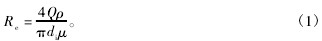 式中:Qe為流體流量,m3/s;di為內徑,m;μ為流體動力黏度,Pa·s;ρ為流體密度,kg/m3。