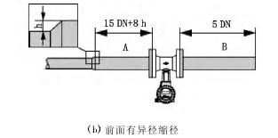 (2)渦街流量計對最小直管段的要求見圖2。當現場存在2個或過多干擾源時,建議遵循最長的直管段要求。圖2中的A表示前直管段,B表示后直管段,h表示管道擴徑時產生的高度差;DN為管道直徑。