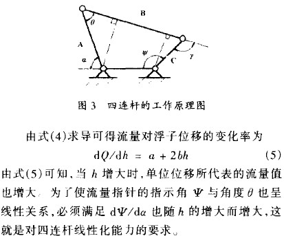 產生位移,浮子的位移通過磁鋼4、5的禍合傳給平衡桿6。此時,位移和流量的關系為非線性,必須通過連桿8、9、10進行線性化才能使指針11有線性流量指標。四連桿的工作原理如圖3所示。