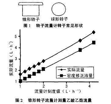 轉子流量計常見的轉子形狀如圖1所示,左邊圖形的轉子用廣泛,為錐形轉子;右邊的圖形為圓珠形,為球形轉子。用這兩種轉子流量計,經過測量,得到下列較為幾個典型的圖例。在錐型轉子流量計中,粘度為0.52mpa.s、密度為900kg·m-3’的液體乙酸乙醋的實測結果見圖2,粘度為1.gmPa·s、密度為1050kg·m-3的丁內醋的實測結果見圖3,圖中所示的密度修正流量曲線指的是僅以密度進行修正的曲線,其修正公式為。