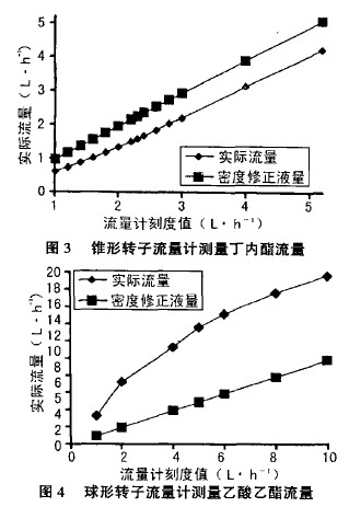 用球形轉子流量計測量乙酸乙醋的結果見圖4,由圖可知,球形轉子流量計的這種類型,粘度對其的影響非常之大,且實際流量的線性度也極差。所以在實驗中絕對不可忽視粘度對示值的影響。