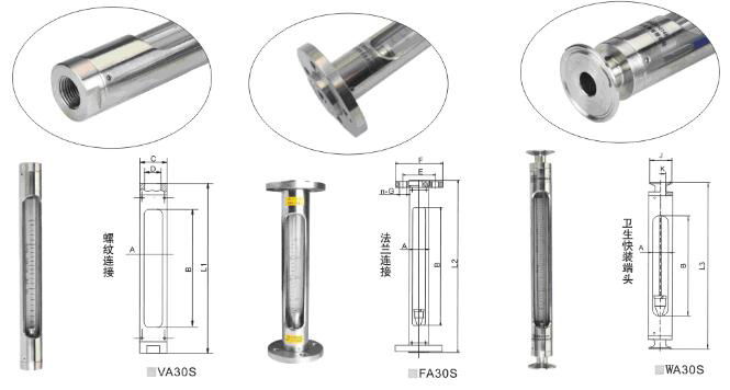 LZB-VA/WA/FA 30S系列玻璃轉子流量計外殼為不銹鋼304材質,接口有內螺紋、活套法蘭、衛生型快裝接頭三種規格連接新形式,產品輕巧美觀適用。