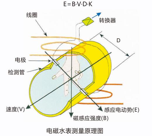 根據法拉第電磁感應原理,在與測量管軸線和磁力線相垂直的管壁上安裝了對檢測電極,當導電液體沿測量管軸線運動時,導電液體切割磁力線產生感應電勢,此感應電勢由兩個檢測電極檢出,數值大小與流量成正比例,其值為:
