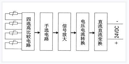 多路溫度遠傳監測儀是一臺最多支持四路輸入、自動選擇最大一路的4-20mA二線制輸出的信號隔離轉換器,它可就近安裝在測量點附近 ,二線制輸出同時作為信號傳輸和儀表的供電電源線.4~20mA輸出電流分為兩個部分,恒定的4mA電流作為測量零點,同時又是儀表電子線路的供電電流,而疊加在4mA上的0~16mA變化的電流是正比于被測量輸入信號的變化,例:0~150℃測量信號對應于4~20mA的電流信號輸出.熱電阻/熱電偶傳感器的測量信號通過輸入電路(選擇高信號)或選點輸入電路選中某一路信號,該信號通過放大和電壓/電流(V/I)轉換單元將放大器的輸出電壓轉換為4~20mA恒定電流輸出,原理框圖如下圖所示:
